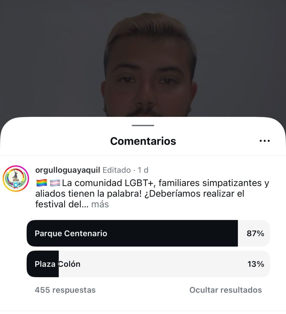 El Comité Organizador del Orgullo Guayaquil 2025 celebra con orgullo los resultados de la encuesta realizada entre la comunidad LGBTI+ y sus aliados, reafirmando nuestro compromiso con la democracia y la participación ciudadana. En tan solo 24 horas, desde el 22 de junio a las 19:00 hasta el 23 de junio a las 19:00, un total de 455 personas votaron en nuestra cuenta de Instagram @OrgulloGuayaquil para decidir el lugar del festival “Del Amor, la Diversidad y el Respeto que Transforma”, programado para el 28 de junio. Los resultados son contundentes: el 87% (396 votos) optó por exigir el Parque Centenario, mientras que el 13% (59 votos) aceptó realizar el festival en la Plaza Colón, asignada por el Municipio. Esto a partir de la pregunta: ¿Deberíamos rechazar la Plaza Colón y exigir que el festival se realice en el Parque Centenario, como otros eventos cívicos y religiosos? Correlacionando a otras votaciones que hemos realizado para 7 días, a un período de 24 horas la del lugar del festival, la comunidad ha demostrado una energía y compromiso excepcionales, consolidando al Orgullo Guayaquil como un movimiento vivo y democrático. La clara preferencia por el Parque Centenario refleja el deseo de la comunidad de contar con un espacio emblemático, donde eventos cívicos, religiosos y deportivos se han realizado libremente, en contraste con la exclusión que hemos enfrentado.