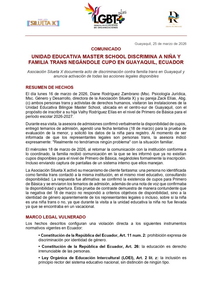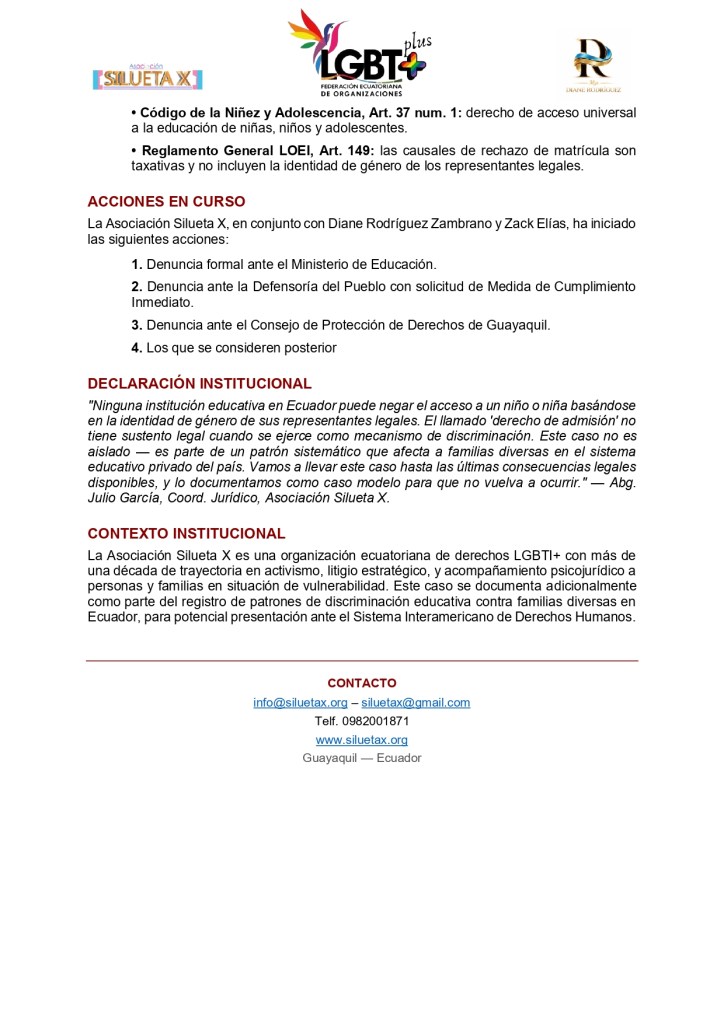 - Exhorto de Cumplimiento: Se conmina a los directivos de la Unidad Educativa Master School a cesar de inmediato cualquier práctica de filtraje basada en prejuicios de orientación sexual o identidad de género.